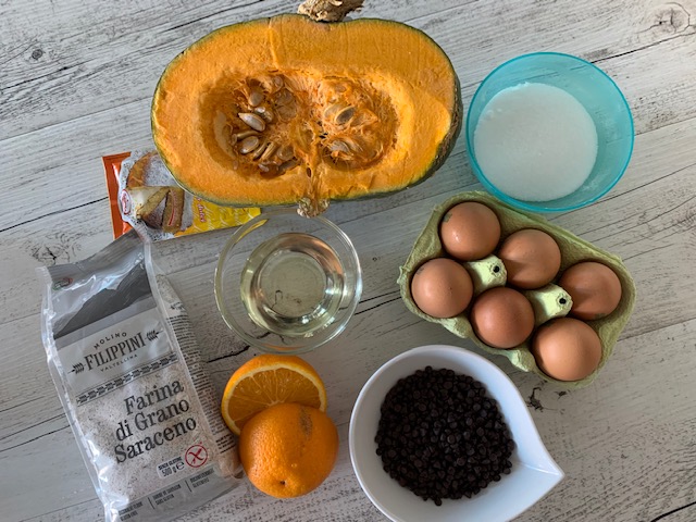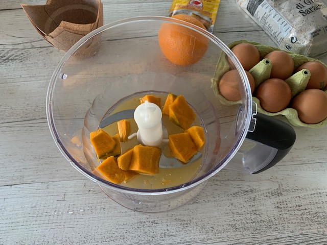 1) Mettete nel frullatore la zucca a pezzetti, l’uovo, l’olio di semi e il succo d’arancia. Frullate fino ad ottenere un composto omogeneo.