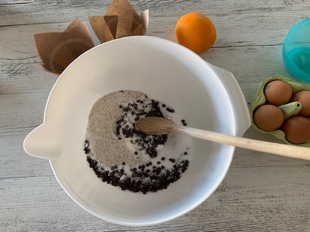 2) In una ciotola create il mix “asciutto” : assemblate farina di grano saraceno , zucchero, lievito e gocce di cioccolato (tenetene da parte qualcuna per fare gli occhietti dei fantasmini) mescolando con un cucchiaio.