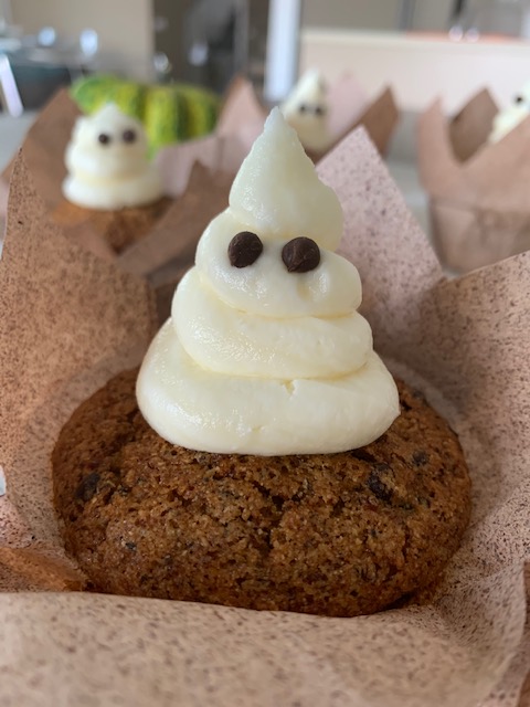 Con l’aiuto di una siringa per dolci, create su ogni cupcake un fantasmino! Usate le gocce di cioccolato per fare gli occhietti..super semplice!!