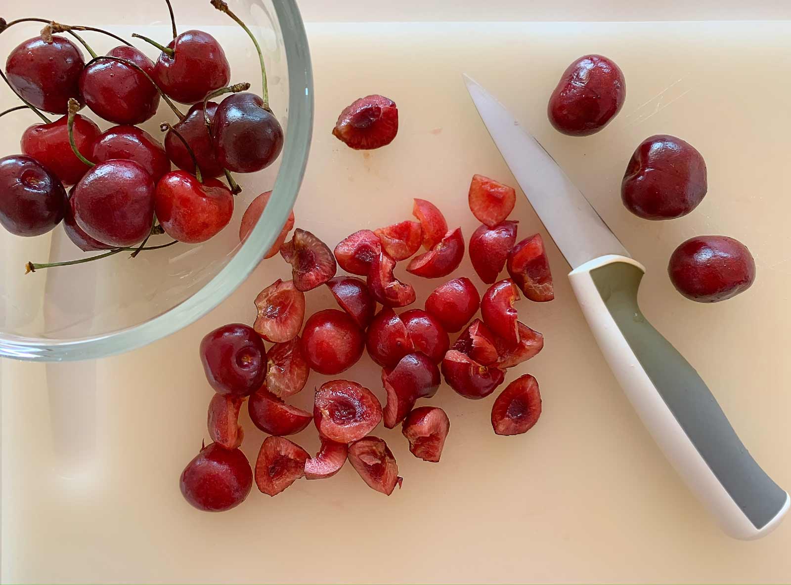 Con l’aiuto di un coltello, dividete le ciliegie in due, togliete il nocciolo e poi tagliatele ancora in due. In questo modo otterrete dei pezzetti non troppo piccoli.