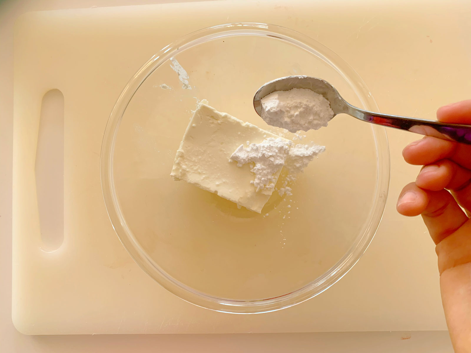 mettete il formaggino spalmabile in una terrina, unite un cucchiaino di zucchero a velo e mescolate velocemente con una forchetta in modo da ottenere una crema . Sarà piuttosto compatta, ed è proprio quello che serve per assemblare il nostro semifreddo.
