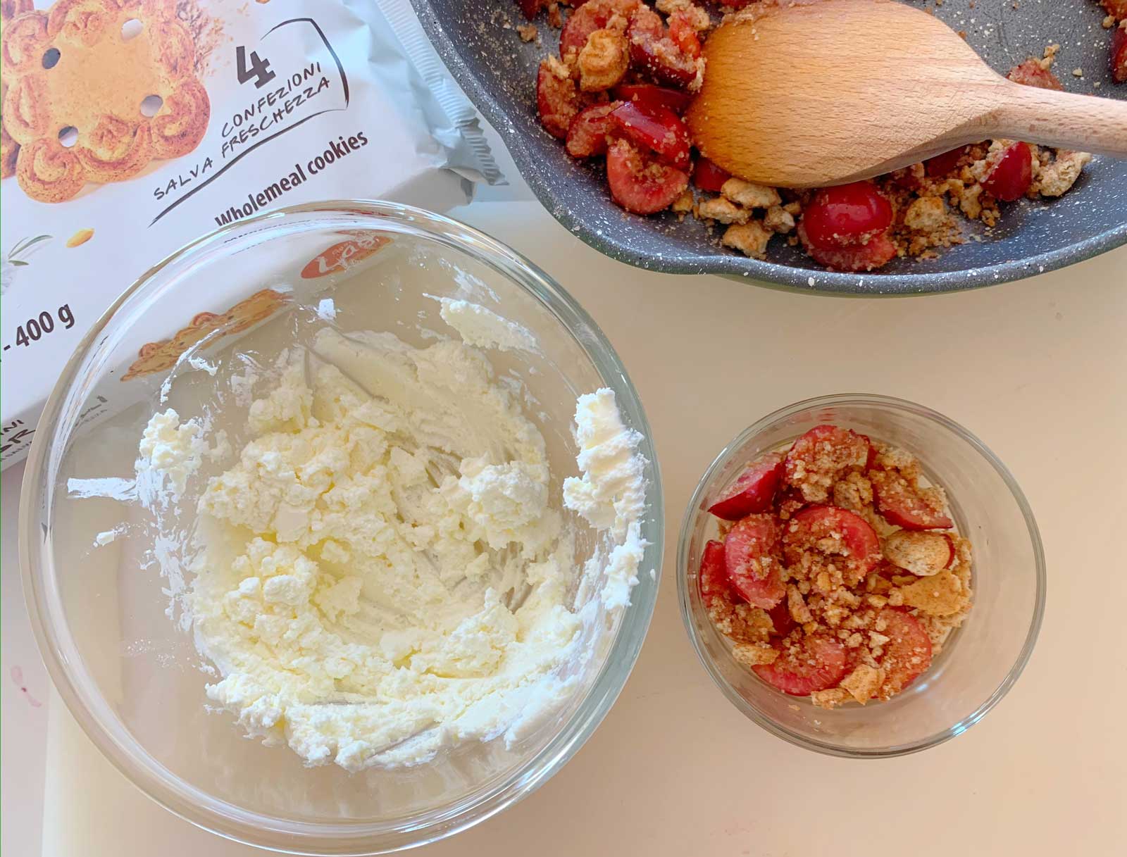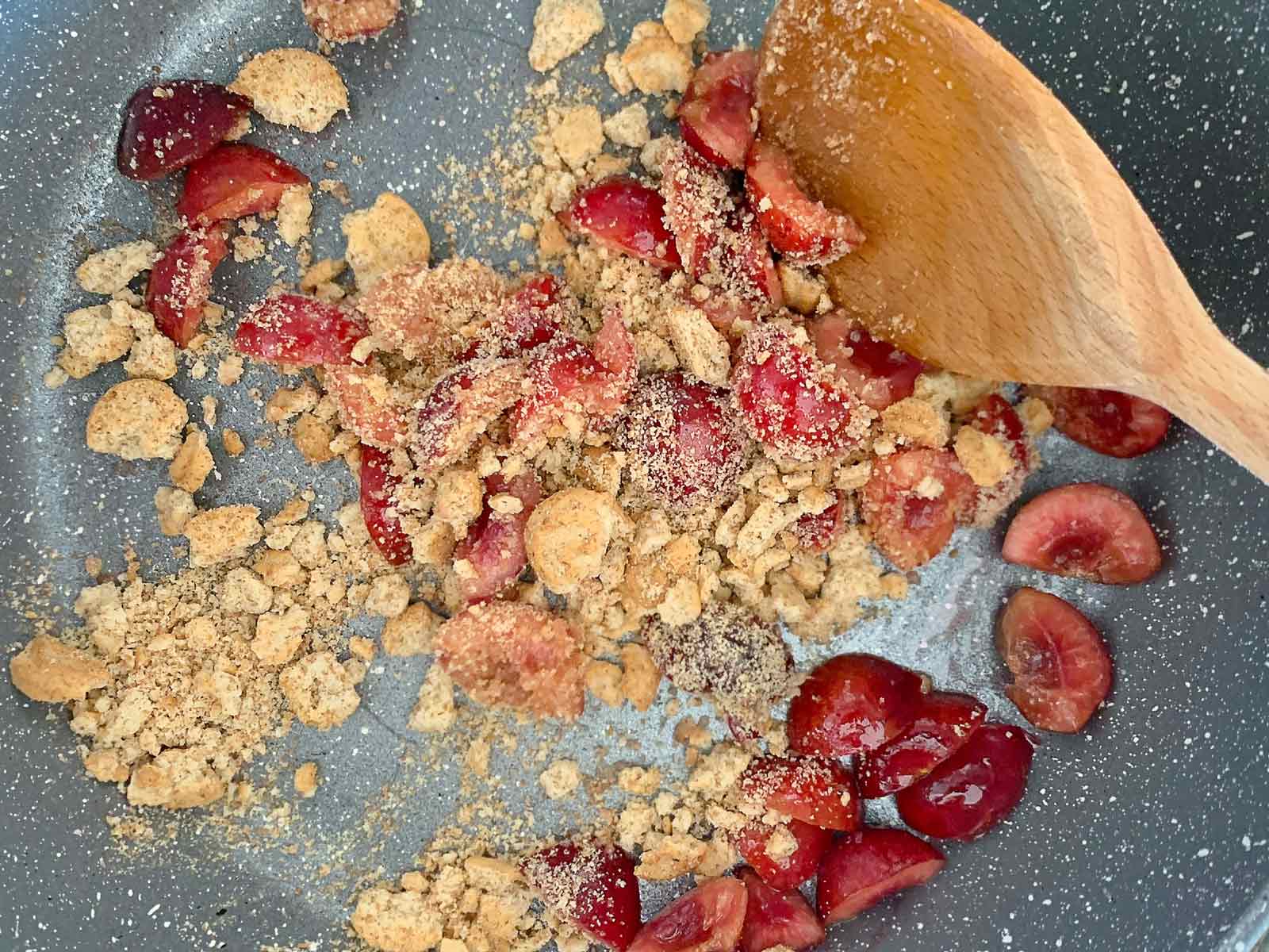 In una padella antiaderente, mettete a sciogliere la mini noce di burro (davvero poco) e poi aggiungete le ciliegie. Unite un cucchiaino di zucchero di canna e i biscotti sbriciolati. Mescolate delicatamente e fate tostare per pochi minuti in modo da ottenere un crumble. Una volta fatto, togliete dal fuoco e mettete da parte.